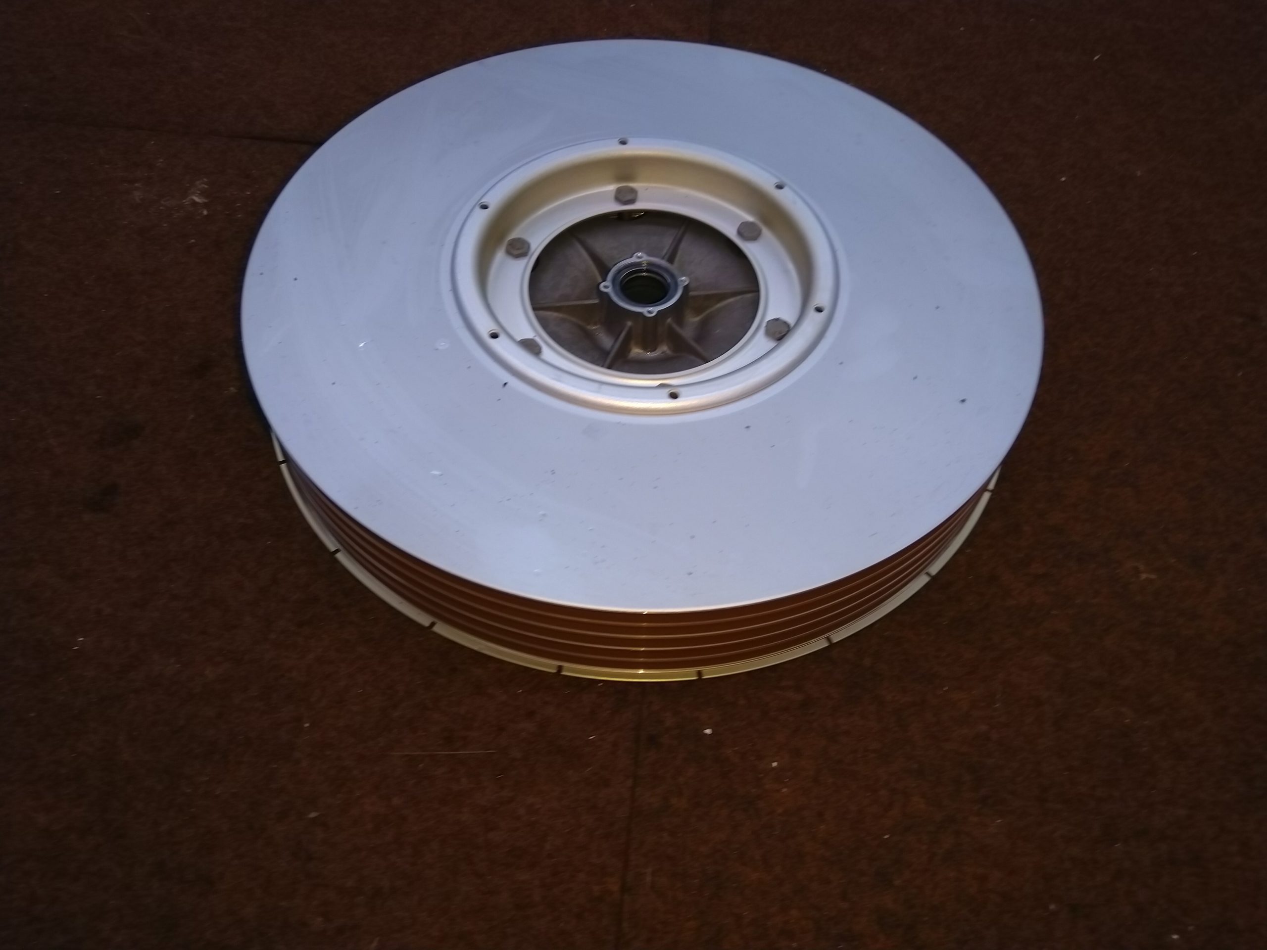 On the drive with the system disk in it, we could get the spindle to unscrew, but we couldn’t get a pack handle on anymore because the locking balls were stuck in the out position. We initially tried squirting some PlusGas releasing fluid down the centre of the disk through the holes in the locking spindle to try and release the disk from the centre. This didn’t seem to have much effect. Upon a closer look at the disk structure, we thought that maybe the centre was hollowing and that there were air holes in the centre. This was confirmed when I found a disk in the pile of disks that was unlabelled and looked unimportant, and decided to experiment by removing the plastic top. It turns out that removing the plastic top provides access to remove the spindle lock and release mechanism which lets you see the centre locking mechanism. We also confirmed that on the bottom of the disk is an air filter, and the inside is indeed hollow. So not knowing where the disk was binding, and not even really knowing what the drive spindle looked like, we decided to try and get some PlusGas release fluid into the centre. We started by removing the plastic top of the disk: